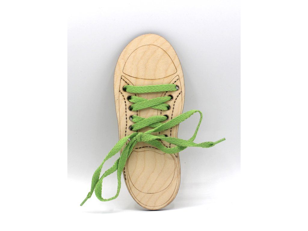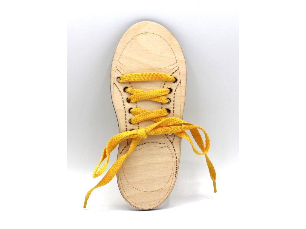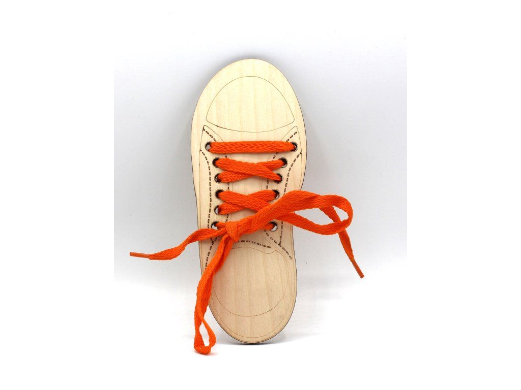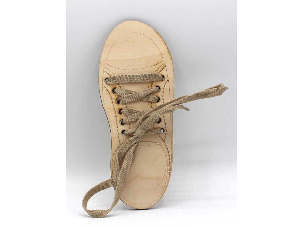 Bota určená k učení se zavazování tkaniček. Výrobek není lakovaný, můžete jej dále barevně dotvořit pastelkami, fixy nebo barvami.Materiál: dřevěná překližka, polyesterová tkanička