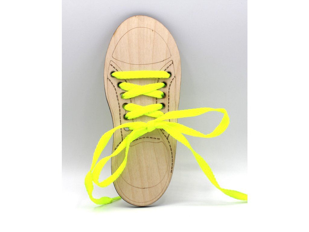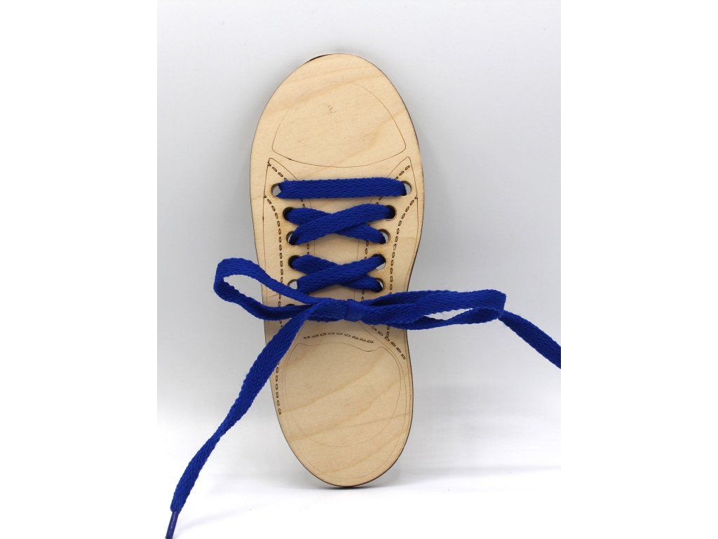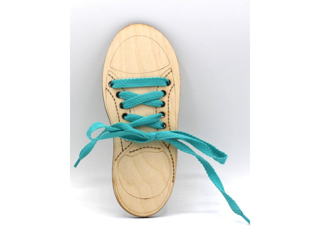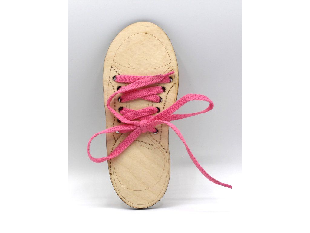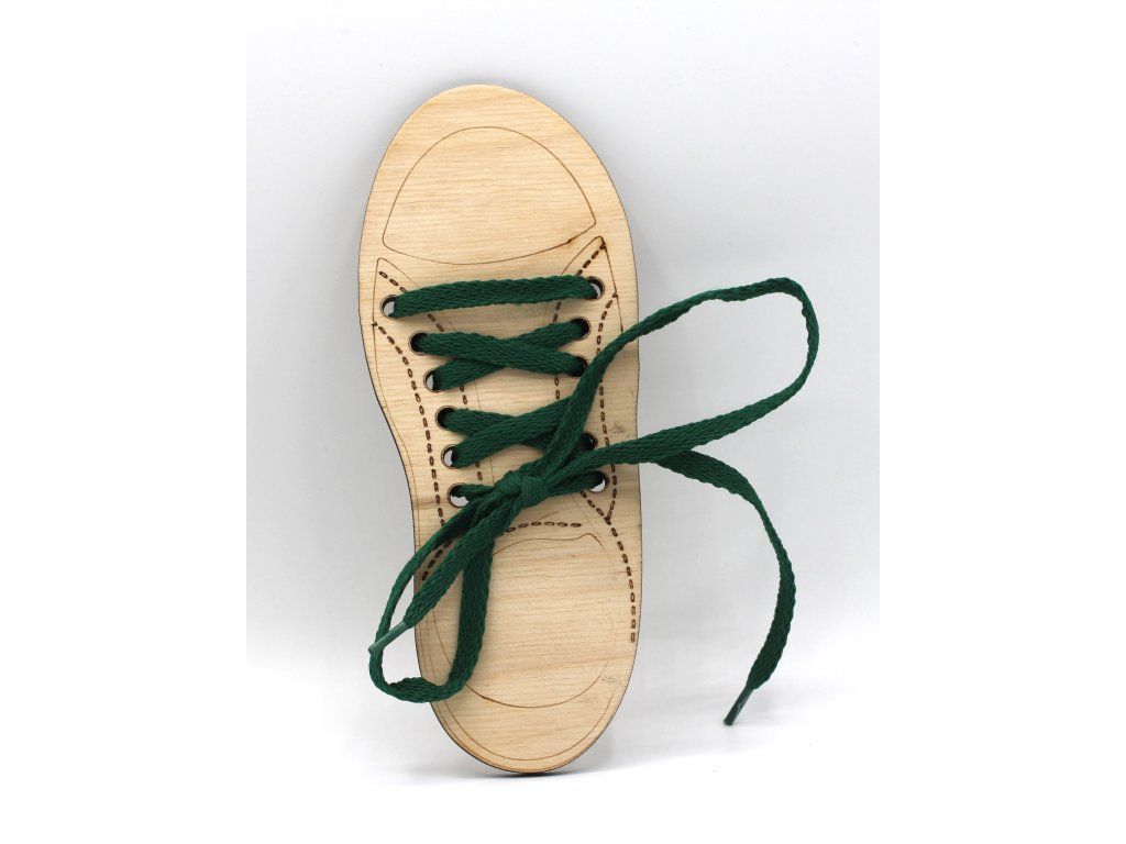 Bota určená k učení se zavazování tkaniček. Výrobek není lakovaný, můžete jej dále barevně dotvořit pastelkami, fixy nebo barvami.Materiál: dřevěná překližka, polyesterová tkanička