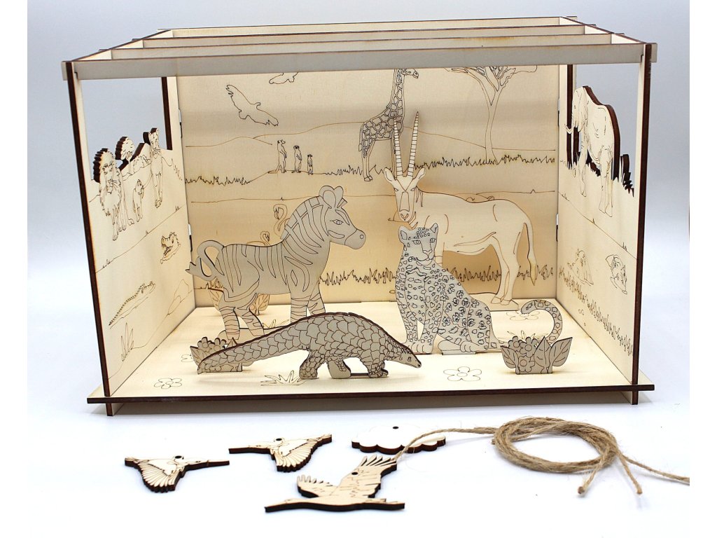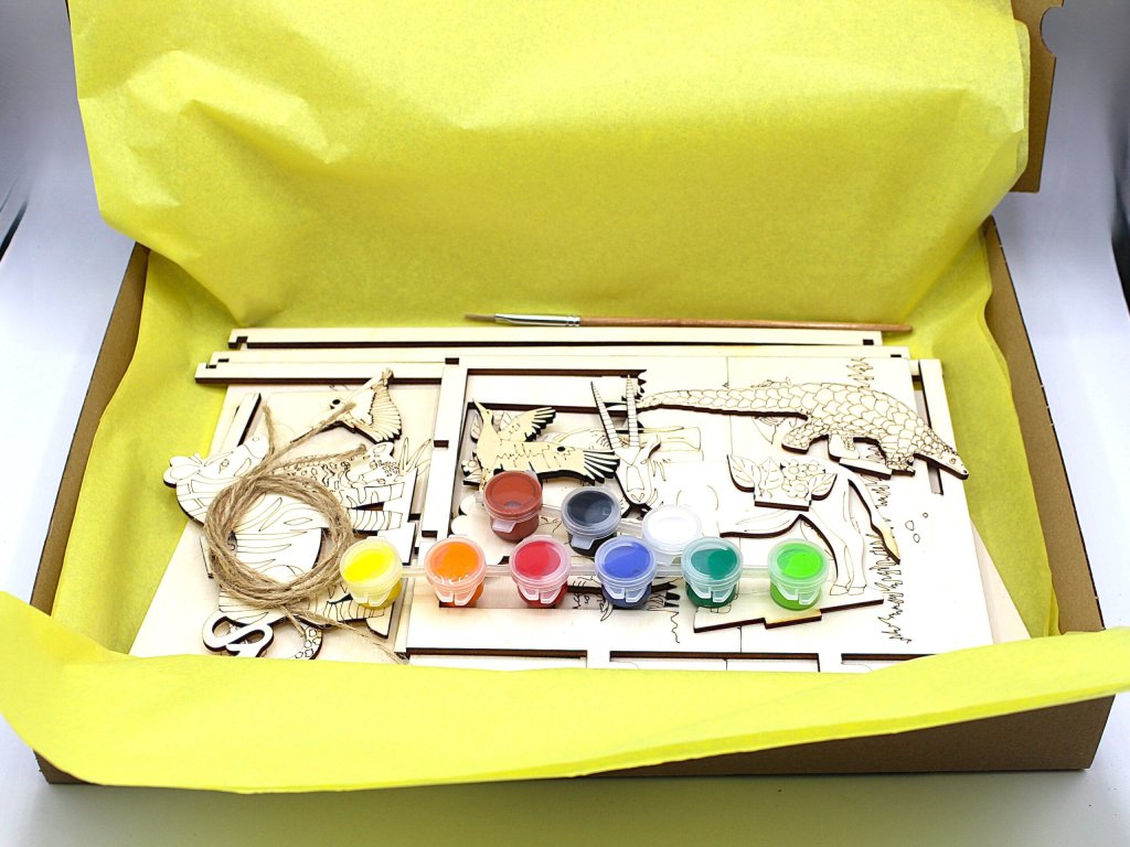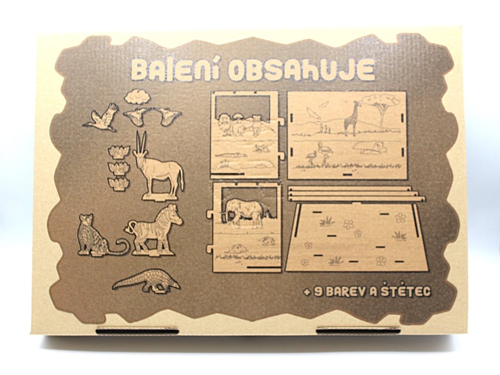 Balení obsahuje dřevěné výřezy, temperové barvy, štětec, návod.