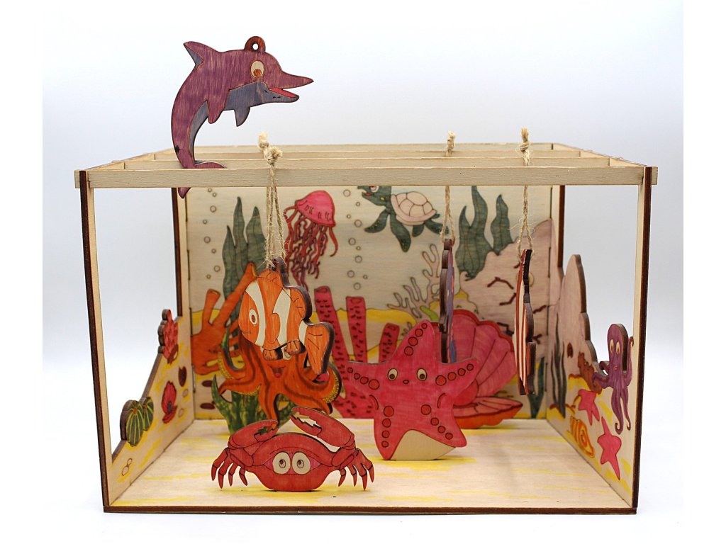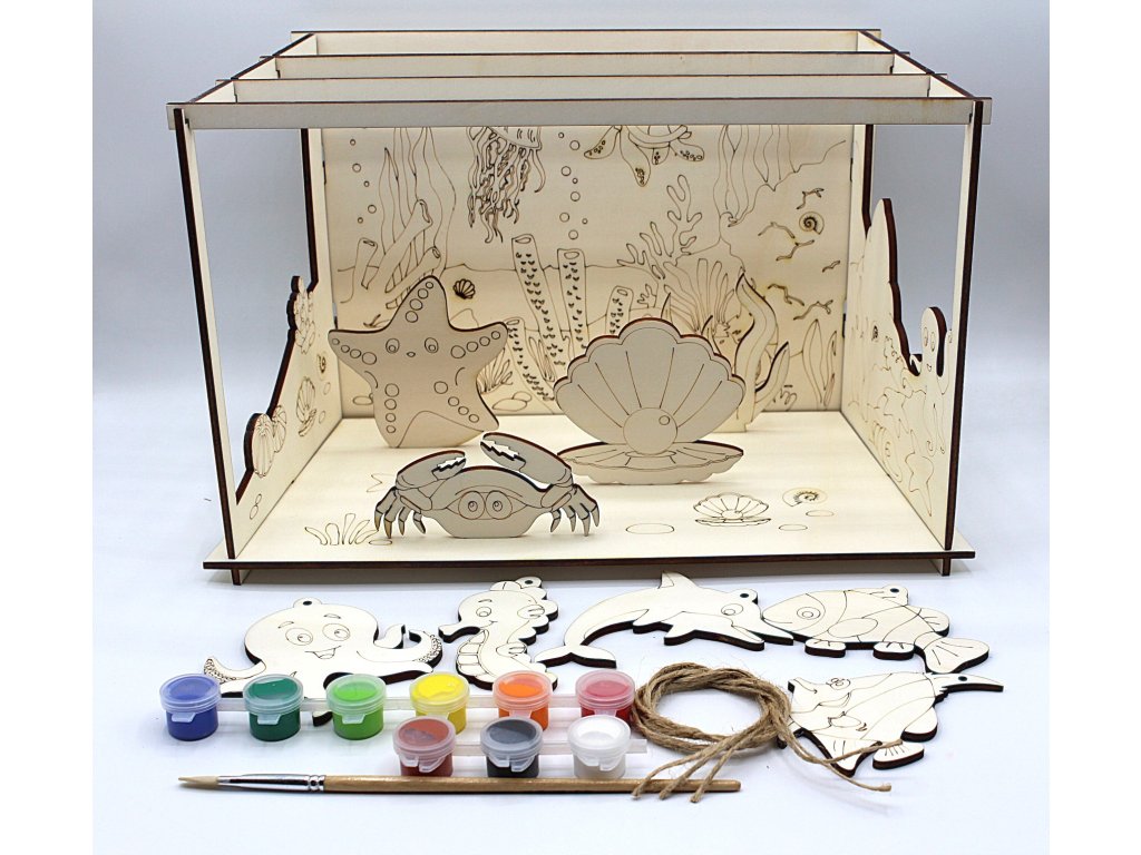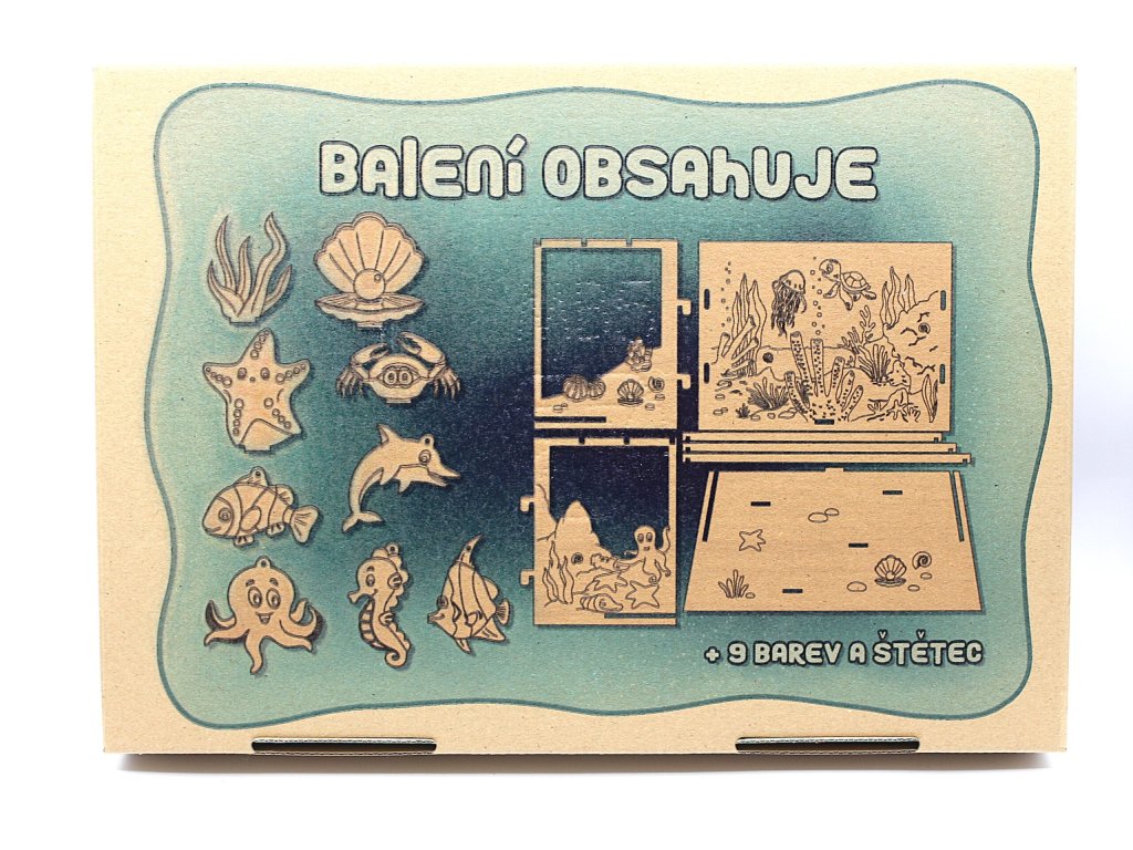 Balení obsahuje dřevěné výřezy, temperové barvy, štětec, návod.