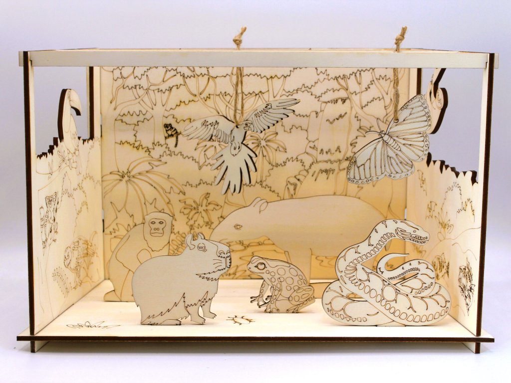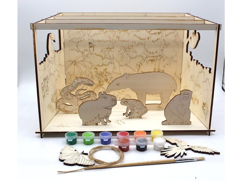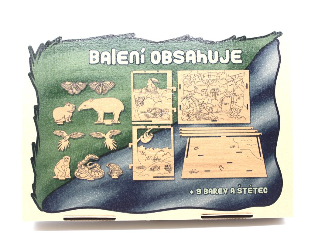 Balení obsahuje dřevěné výřezy, temperové barvy, štětec, návod.