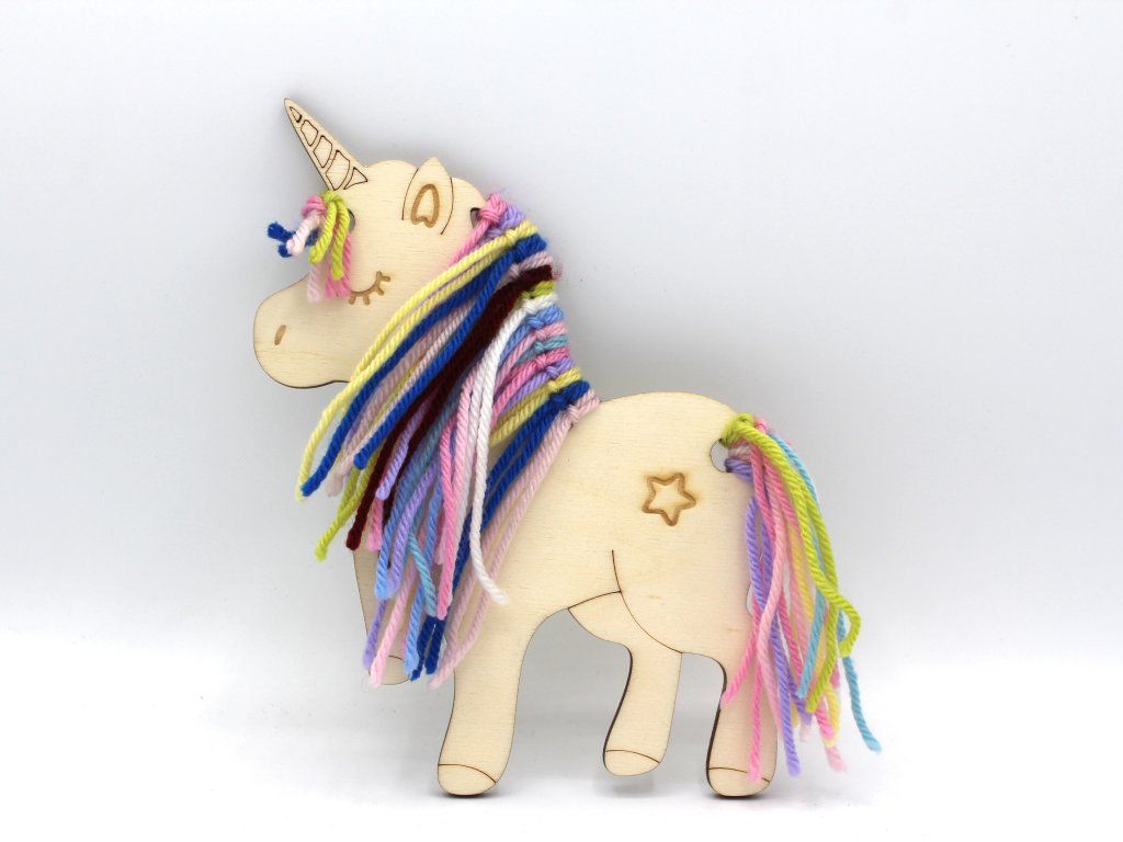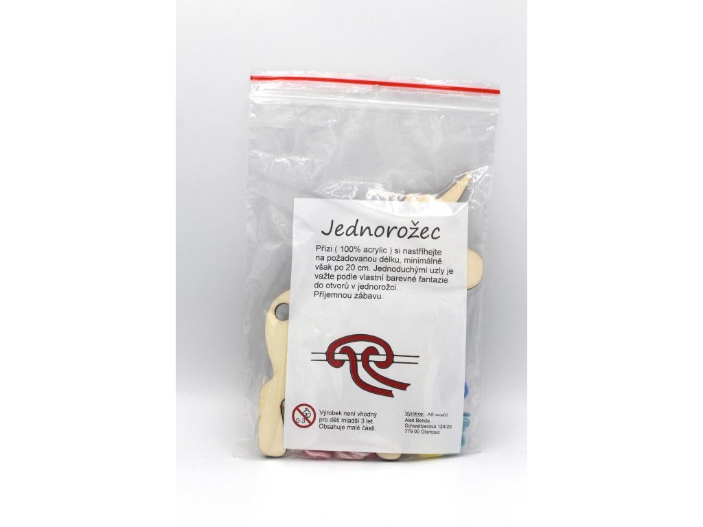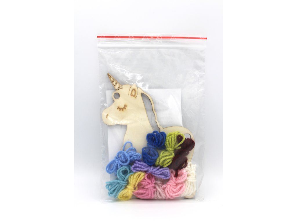 Balení obsahuje: dřevěný jednorožec, příze 100% acrylic - 11 barev po 1 m, návod