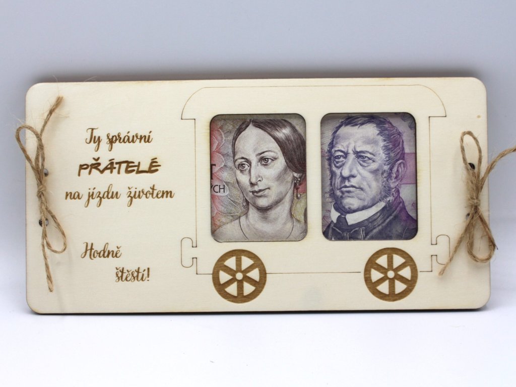 Dřevěná obálka na bankovky. Bankovky poskládejte tak, aby v okýnkách byly vidět portréty.Peníze nejsou součástí balení.