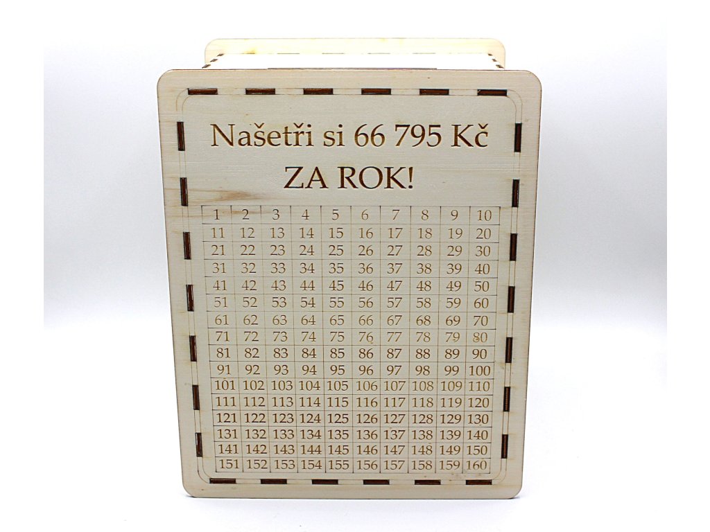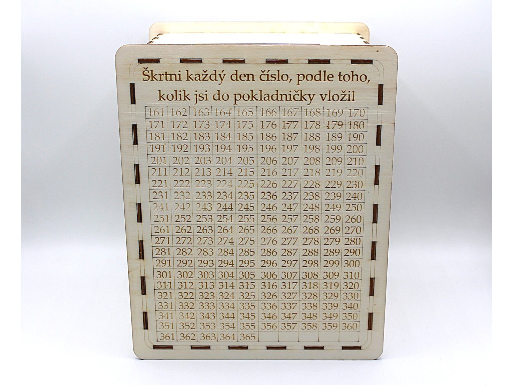 Pokladnička pro spoření celý rok. Každý den vhoďte libovolnou částku z tabulky a tuto částku škrtněte tužkou. Za rok budete mít ušetřeno 66 795,-Pokladnička je vysoká 25 cm.