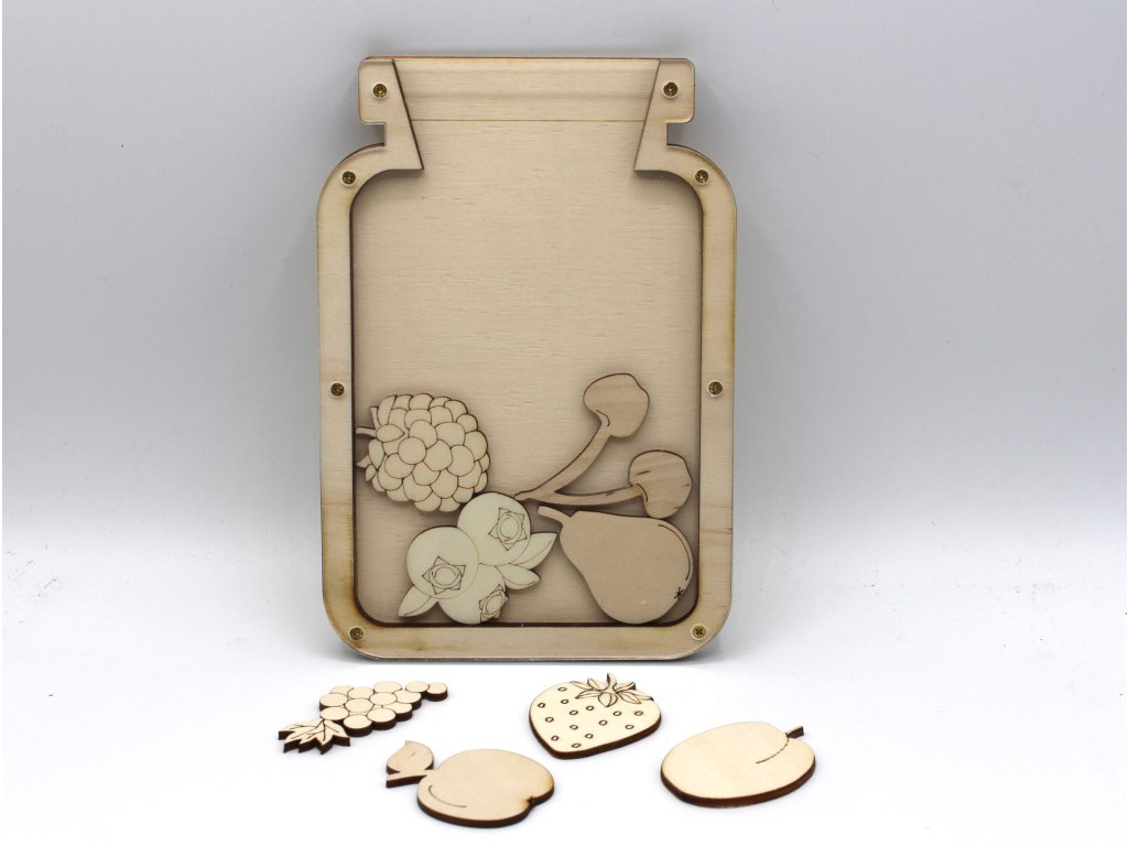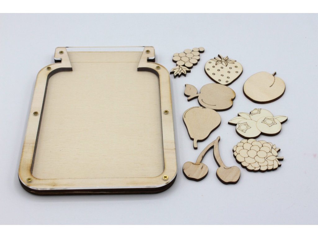 Rozměr: výška 17cm, šířka 12cm.Ovoce se hází do sklenice z překližky a plexiskla a lze jej vytahovat a opakovaně házet dovnitř.